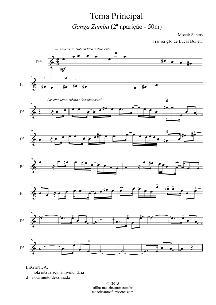 At this passage, some of the notes [marked with a "+"] sound one octave higher than they should and others [marked with a "d"] sound out of tune. Those performance "errors" are pertinent to the movie’s scene, because the music is presented diegetically by the Aroroba character, in a situation in which he would have almost any control of the instrument, making those "errors" a character of great narrative veracity.