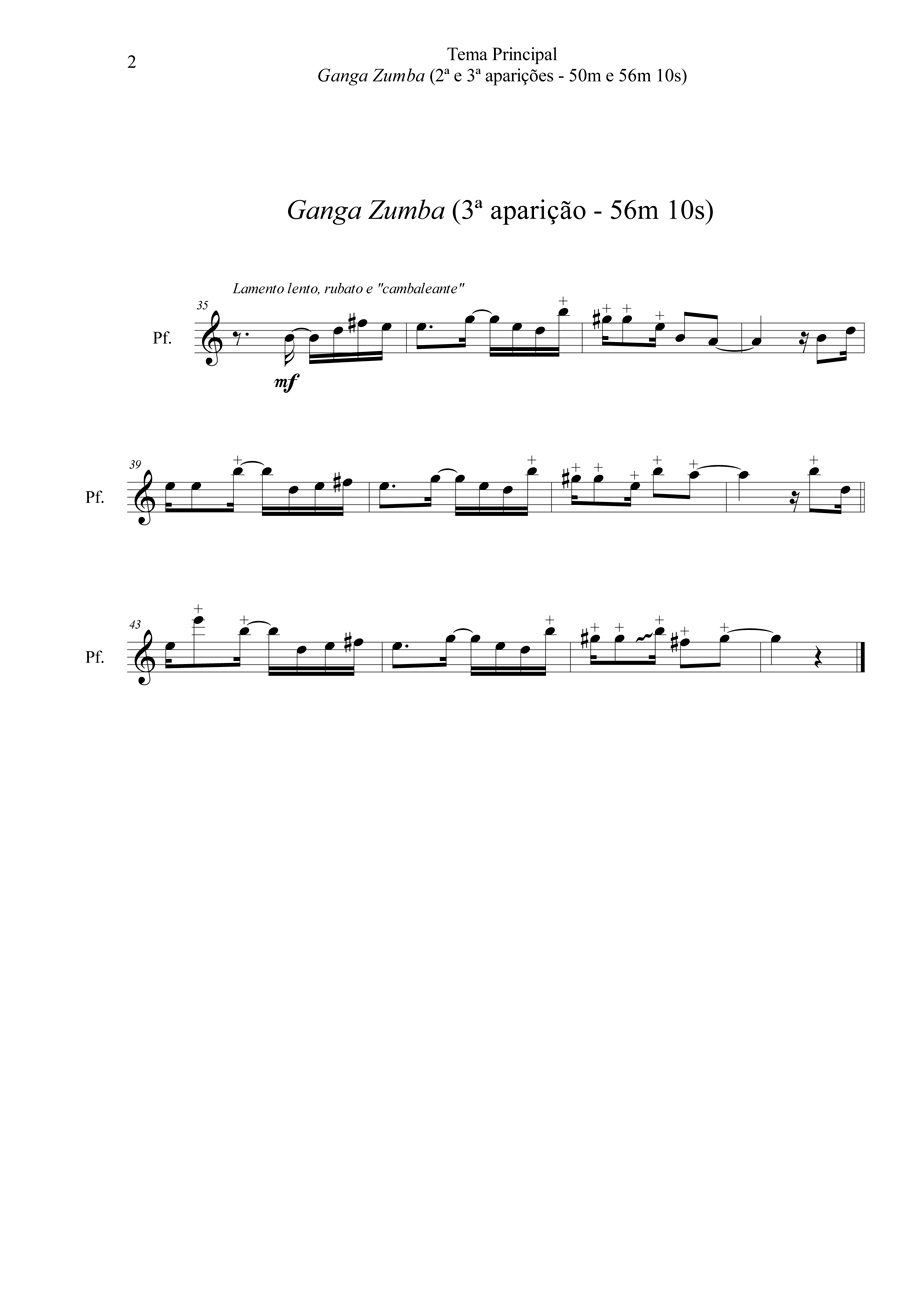 Nesse trecho, algumas das notas tocadas [marcadas com um “+”] soam uma oitava acima do que deveriam e outras [marcadas com um “d”] soam desafinadas. Tais “erros” na interpretação do tema são pertinentes à cena, pois a música é apresentada diegeticamente pelo personagem Aroroba, em uma situação na qual dificilmente ele teria domínio sobre o instrumento, dando às imperfeições um caráter de grande veracidade narrativa.